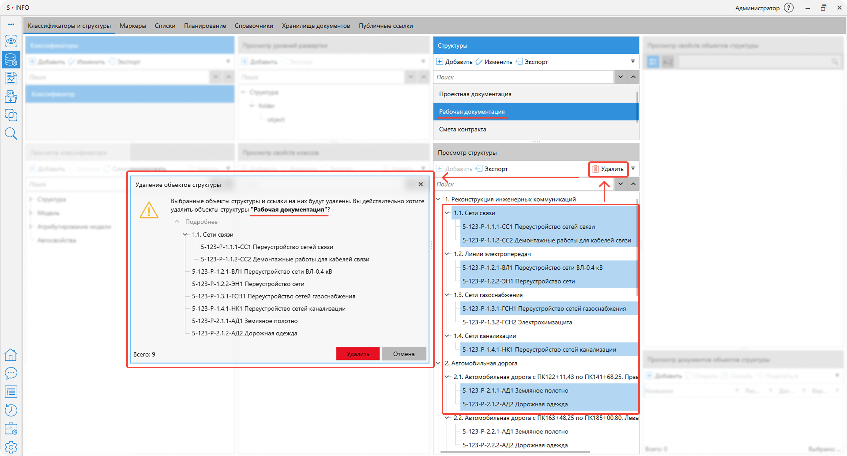 Диалоговое окно удаления. Произведена доработка диалогового окна, активируемого при осуществлении процедуры удаления объектов. Окно дополнено кнопкой «Подробнее», благодаря которой пользователь получает доступ к детальному перечню объектов, подлежащих удалению.