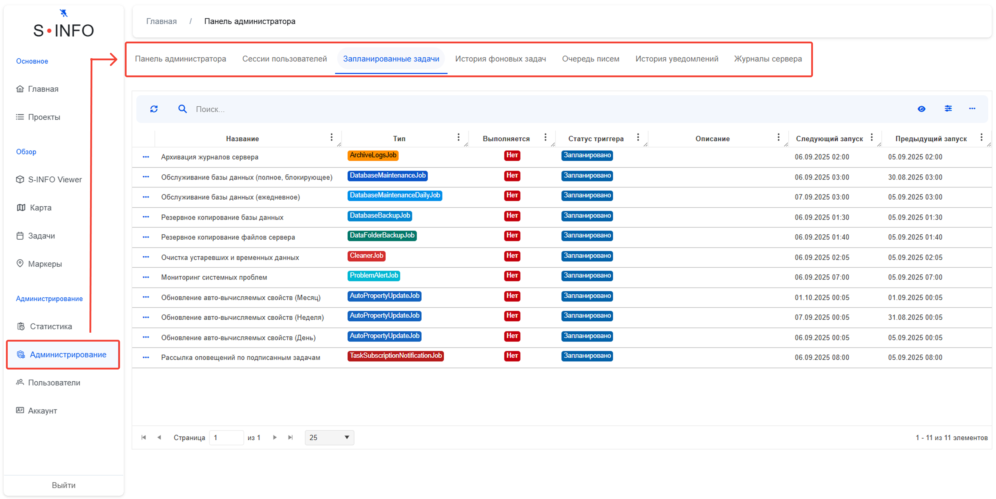 В новой версии программного обеспечения S-INFO появился модуль задач по расписанию. Важные системные операции — резервное копирование базы данных и файлов, очистка устаревшей информации, проверка состояния сервера и рассылка уведомлений — теперь выполняются автоматически. Это снижает нагрузку на администраторов и повышает стабильность работы системы.