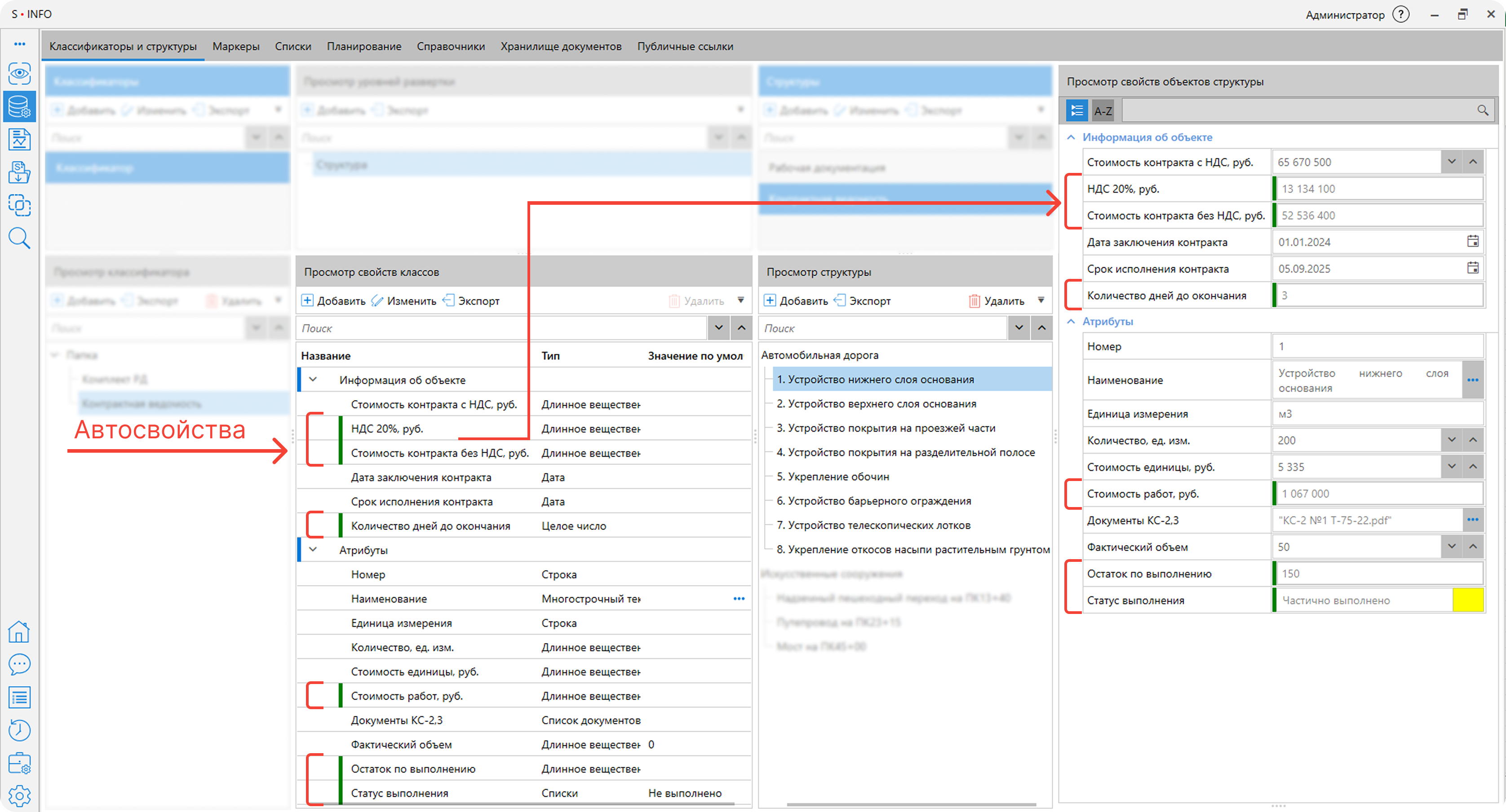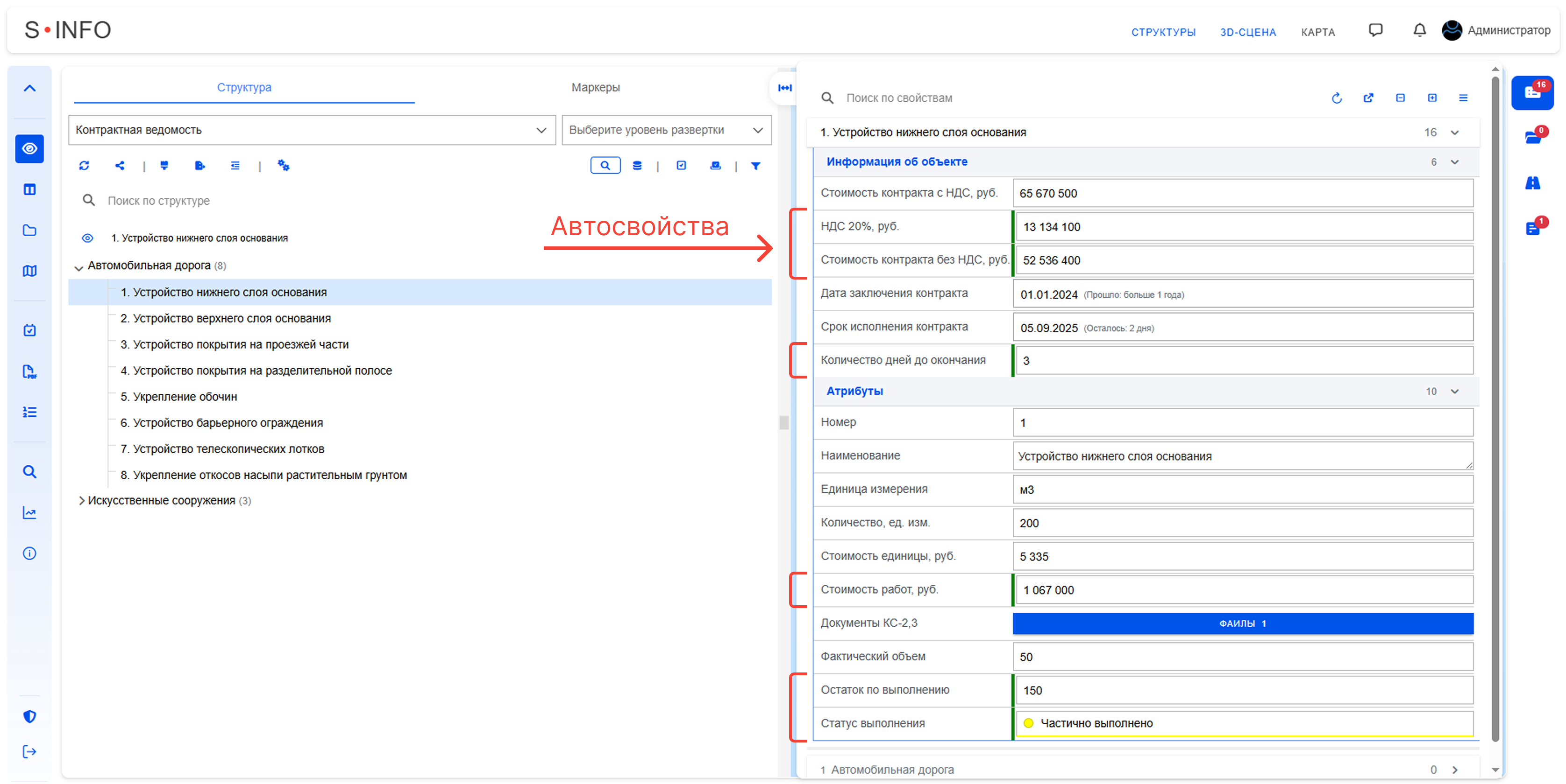 Автосвойства. Функция позволяет автоматически рассчитывать значения, определять статусы и даты в ячейках свойств с помощью языка JavaScript, что даёт возможность создавать сложные алгоритмы обработки данных. Ячейки с автосвойствами выделены в системе зелёным цветом.