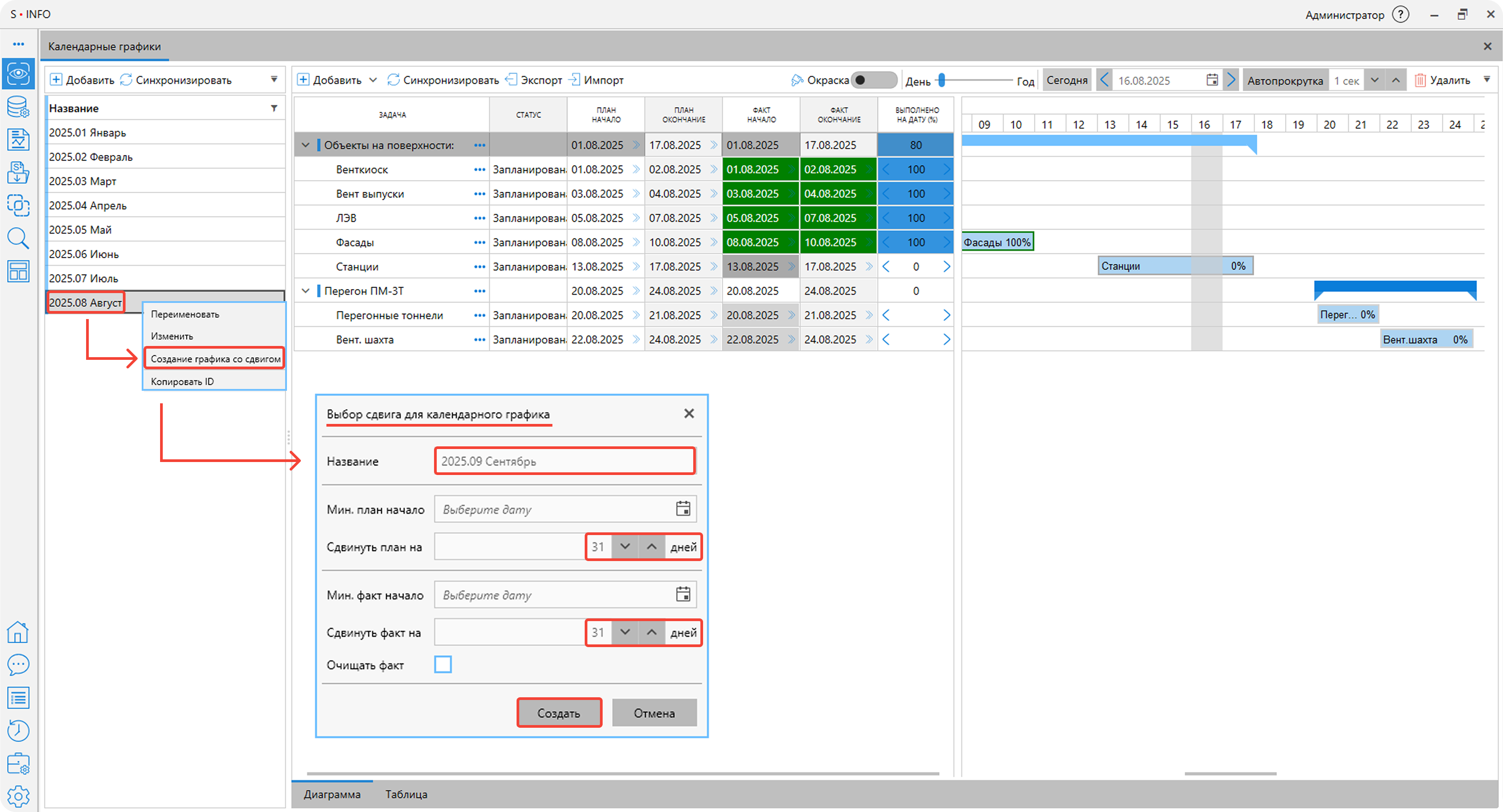 Календарные графики. Реализовано копирование календарного графика со сдвигом по дате. Основное назначение функции заключается в автоматизации процесса планирования периодических проверок и технического обслуживания конструктивных элементов объекта на этапе эксплуатации. Функция также обеспечивает сохранение всех параметров задач при переносе, включая ответственных исполнителей, сроки выполнения и примечания.