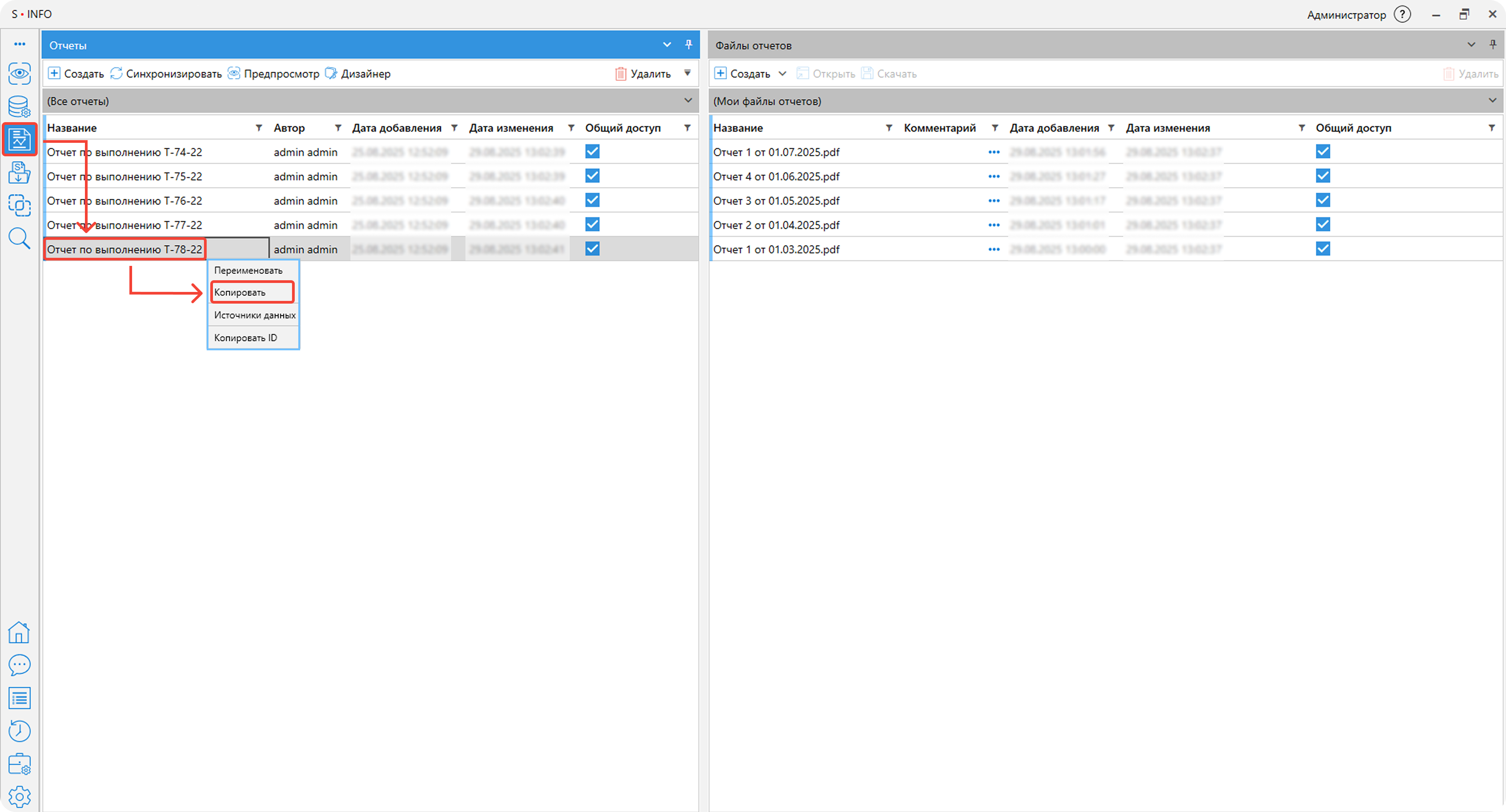 Отчёты. Добавлена возможность копирования отчётов с сохранением шаблона.
