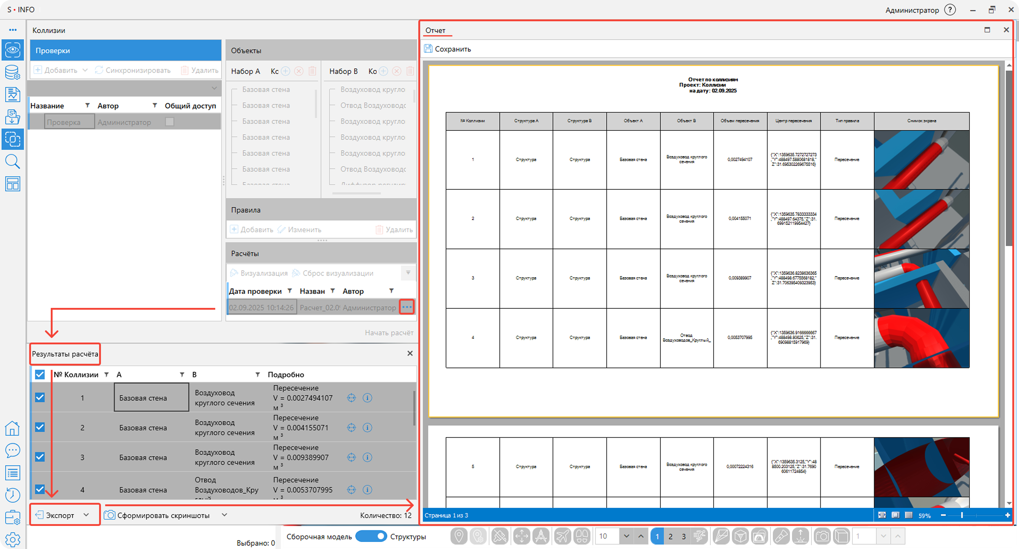 Для обнаруженных конфликтов автоматически формируется детальный отчёт с результатами проверки. Система также делает скриншоты мест пересечений, что значительно упрощает последующий анализ.
