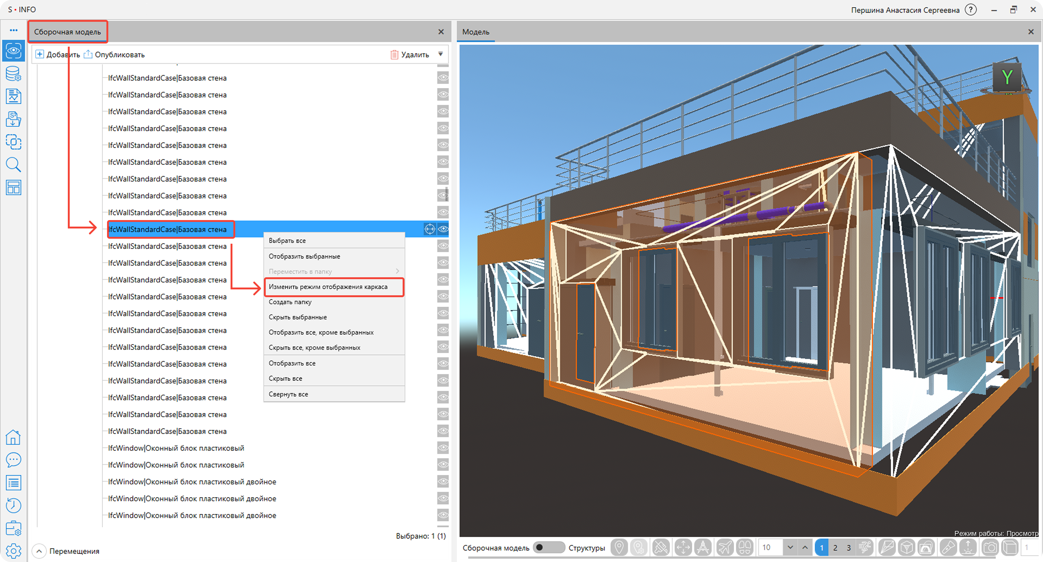 Режим каркаса. Данный режим позволяет просматривать структуру модели в виде системы линий и рёбер, формирующих её основу. Режим каркаса помогает быстрее находить и исправлять геометрические ошибки, проще анализировать пространственные взаимосвязи между элементами, а также видеть, как располагаются детали относительно друг друга.