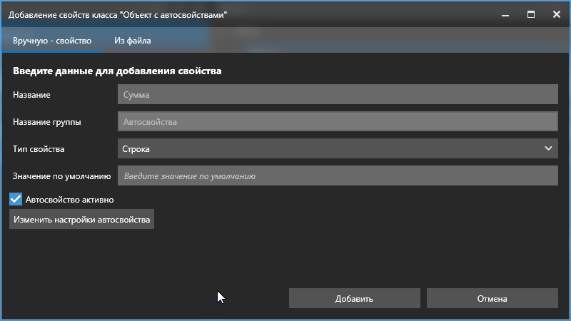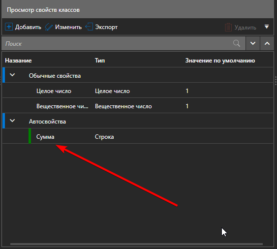 Добавим автосвойство в группу Автосвойства добавленного класса, автосвойство будет типом строка, в которой будет отображаться результат сложения двух числовых свойств класса и выводится в виде «Сумма двух чисел равна …». Для добавления автосвойства необходимо создать обычное свойство (в примере – тип Строка) и установить чекбокс «Автосвойство активно», автосвойство будет добавлено в класс.