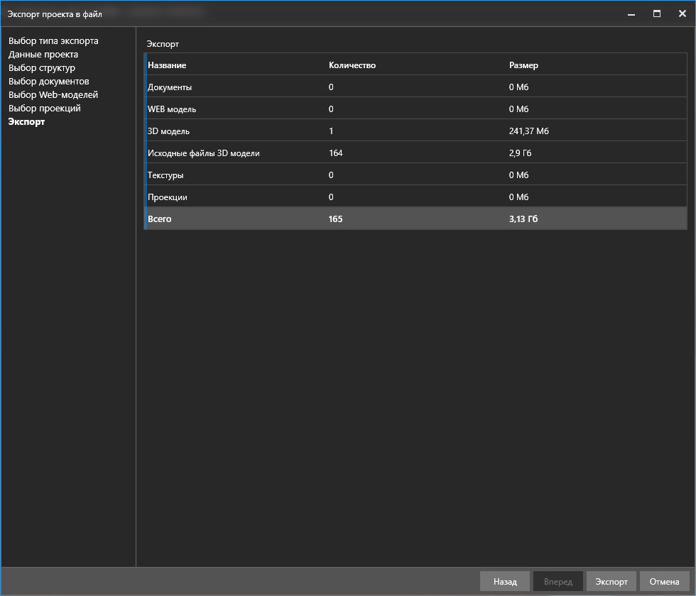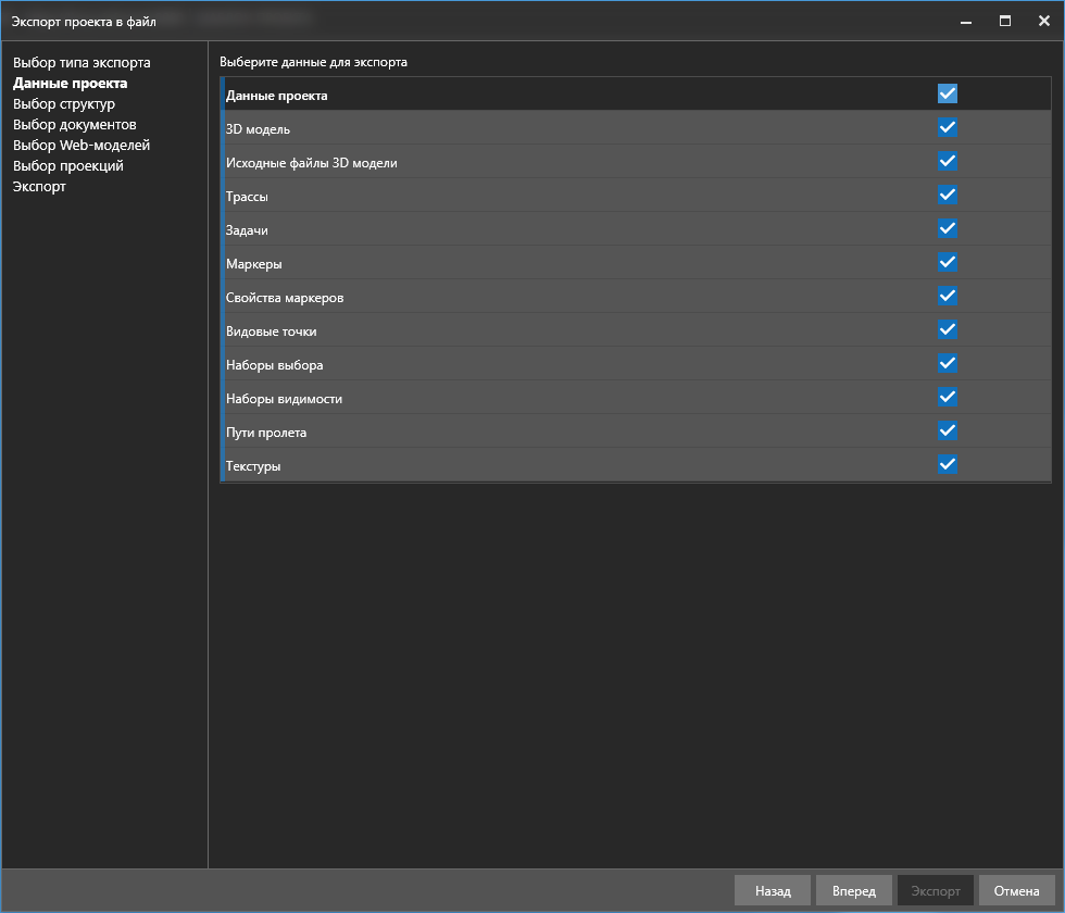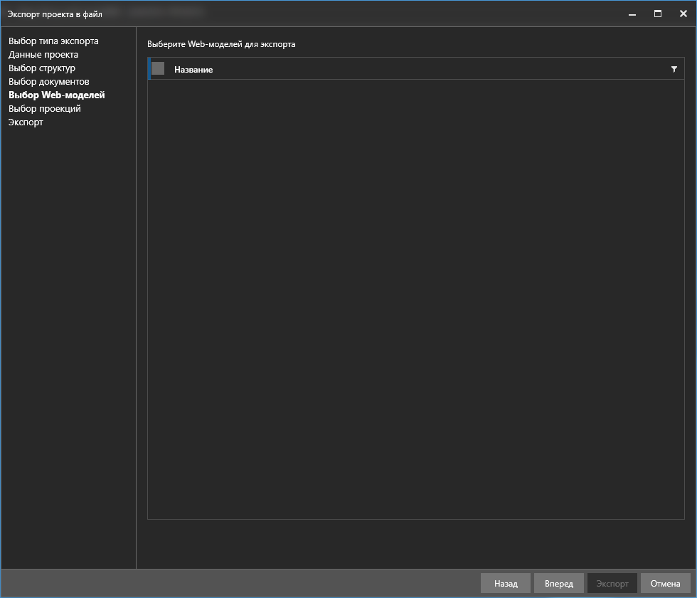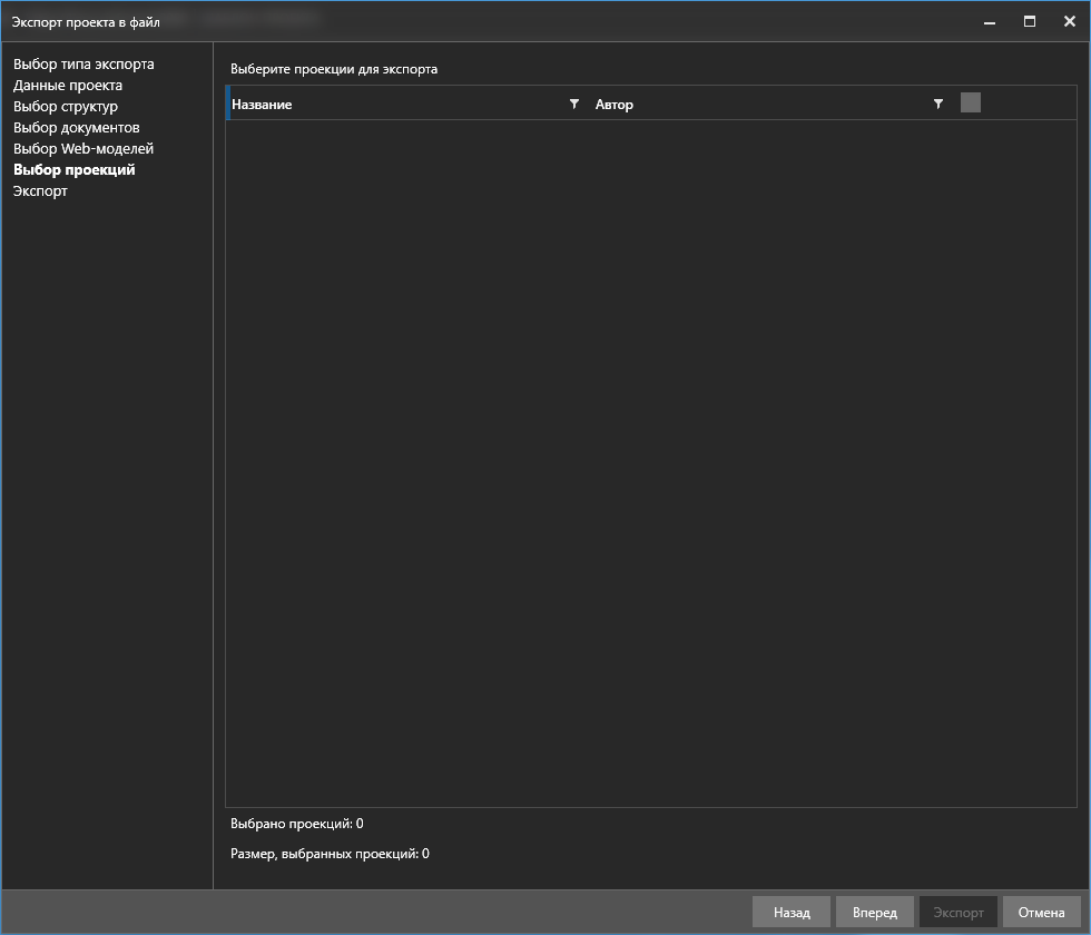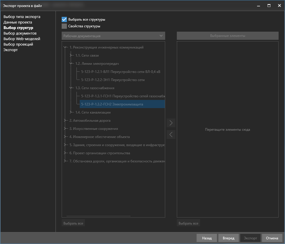 Далее нажимаем кнопку «Вперед», далее выбираем структуру проекта (можно выбрать все структуры, либо определенные);