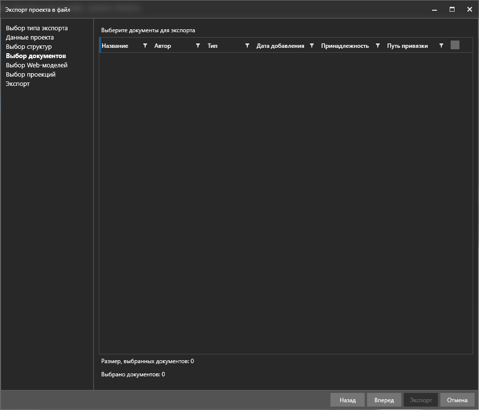 Далее нажимаем кнопку «Вперед», далее выбираем документы проекта;