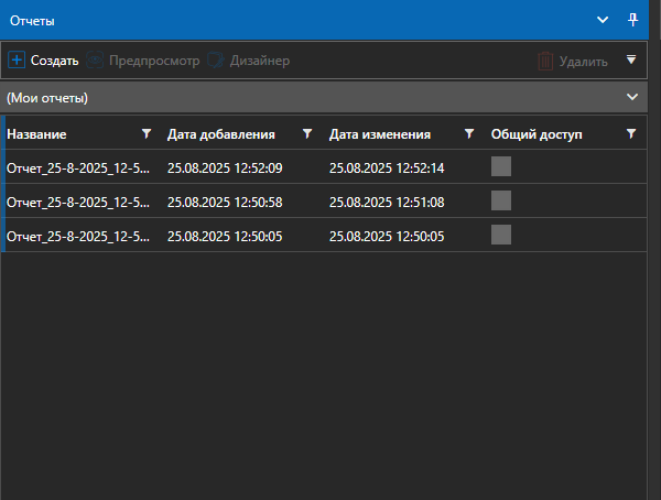 Пользователь может видеть свои отчеты и все отчеты (в том числе те, которыми поделились другие пользователи).