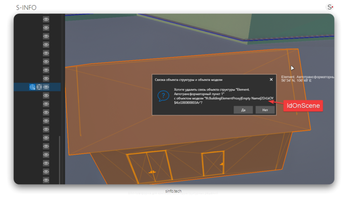 IdOnScene — уникальный идентификатор элемента 3D-модели, обеспечивающий связь модели с данными проекта. Корректная настройка идентификаторов позволяет пользователю синхронизировать элементы модели с проектом, просматривать свойства и взаимодействовать с объектами.