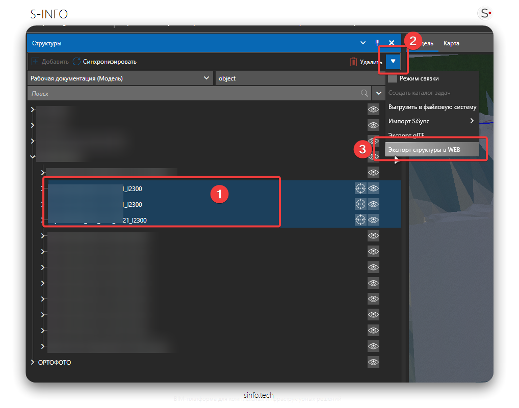 Например, если в структуре имеется верхний уровень «Мост имени доктора S», и вы хотите, чтобы этот мост загружался в веб-клиенте отдельно, выделите его верхний уровень и экспортируйте. В результате получится один файл модели, который будет содержать все объекты, относящиеся к этому мосту.