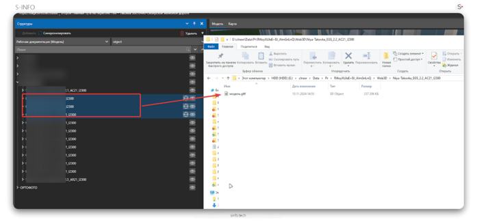Если файлы GLTF выгружаются корректно из ПО с правильными идентификаторами, то каждый элемент 3D-модели будет иметь уникальный идентификатор (IdOnScene), который используется для связи с данными проекта. Это позволяет синхронизировать модель с проектом: выбрать элементы в структуре, просматривать их свойства, фокусировать внимание на определенных частях модели и т. д. Все это возможно благодаря правильной настройке идентификаторов.