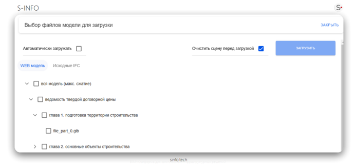 Сборочная модель — это панель для загрузки IFC-файлов. Структура выгрузки зависит от того, какие файлы были загружены в эту панель.