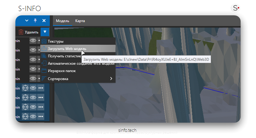 WEB-клиент позволяет отображать 3D-модели (3D модель являться файлом), которые структурированы в виде дерева. Иерархия файлов в файловой системы определяет организацию частей модели в WEB-клиенте. Таким образом, при подготовке модели структура в WEB-клиенте будет идентична иерархии папки загружаемой на сервер, где каждый уровень вложенности папок представляется как уровень дерева элементов в WEB-интерфейсе.