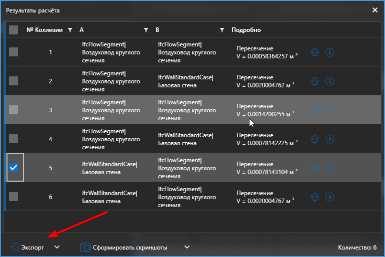 Для подготовки отчета по коллизиям необходимо открыть результат расчета. Затем выбрать коллизии, который необходимы в отчете и выбрать формат для экспорта отчета.