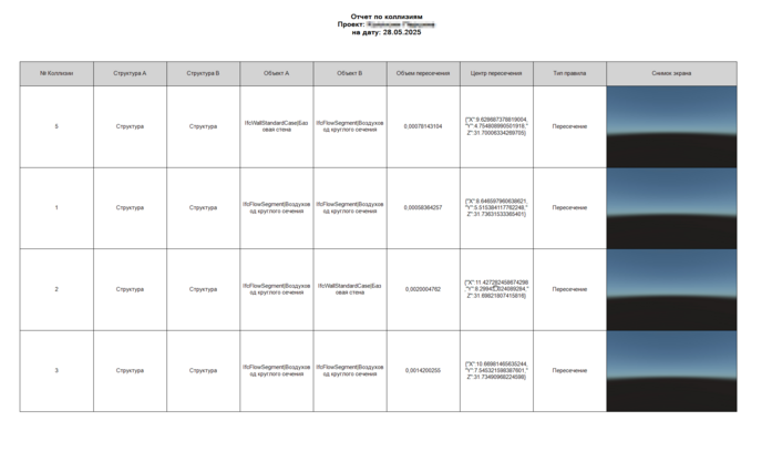 В графическом отчете представлены все коллизии, которые выделил пользователь в результате расчета. В таблице указаны структуры, в которых находится объект, названия объекта, объем тела пересечения (если его удается сформировать), геометрический центр пересечения, тип правила пересечения, скриншот.