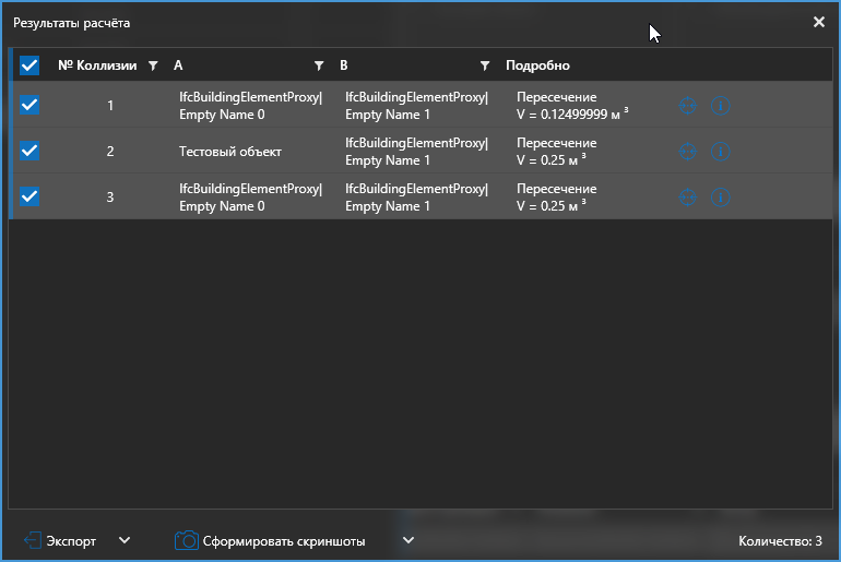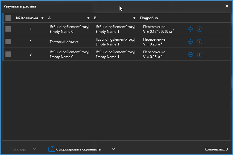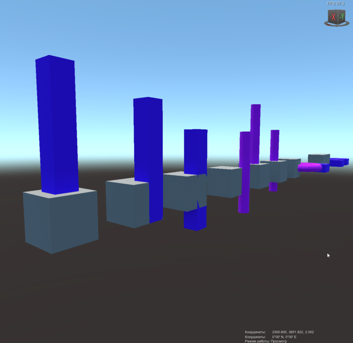 Для примера расчета был создан тестовый проект с графическими примитивами. Задача найти пересечения голубых и серых параллелепипедов.