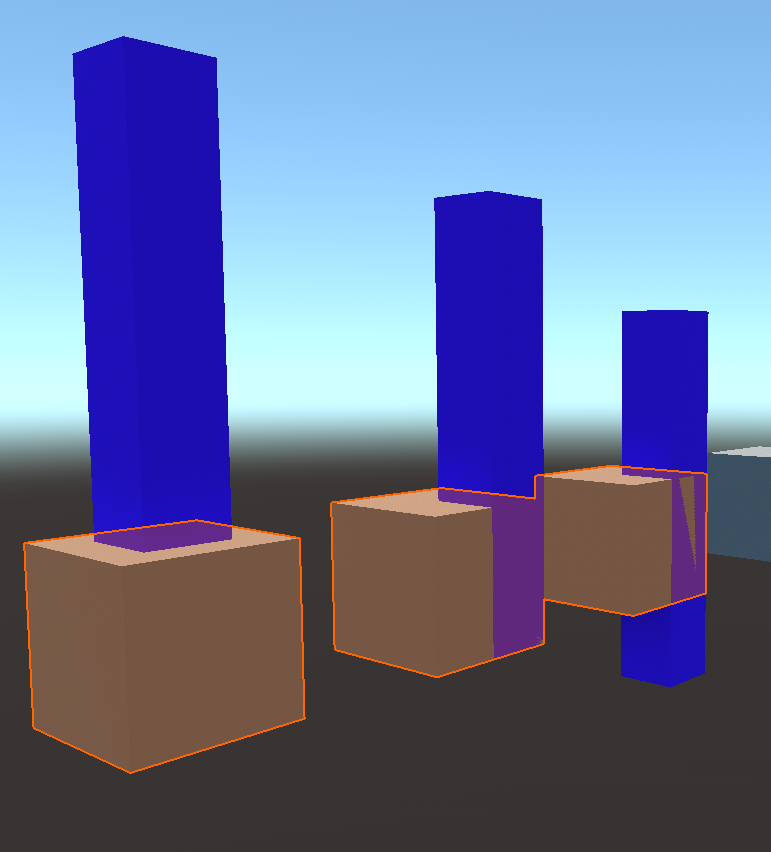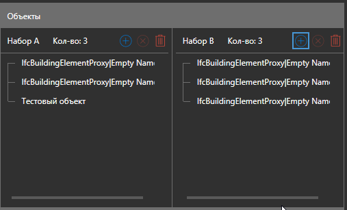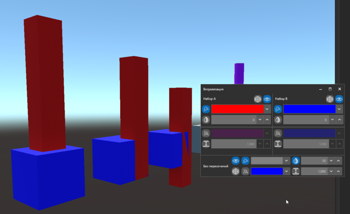 Объекты с коллизиями сделаем красного (Набор А) и синего (Набор В), объекты без коллизий сделаем серыми полупрозрачными.