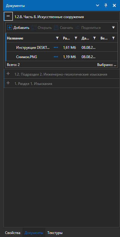 Панель «Документы» осуществляет привязку различных типов файлов (изображения, видео, документы) к выбранному объекту структуры. В этой панели привязываются общие документы объекта, не структурированные в поля данных типа Список документов.