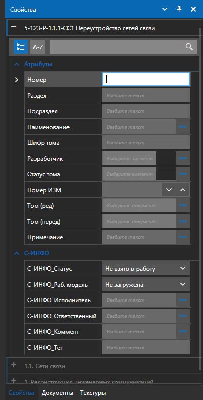 В панели «Свойства» осуществляется редактирование значений свойств. Для редактирования используются соответствующие элементы интерфейса (календари, спинбоксы, чек-боксы, поля ввода, выпадающие списки, дополнительные диалоговые окна).