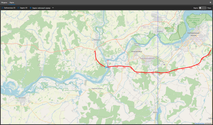 В программном комплексе предусмотрен функционал работы с трассами. Трассы, загруженные в проект, отображаются на 3D модели и на карте.