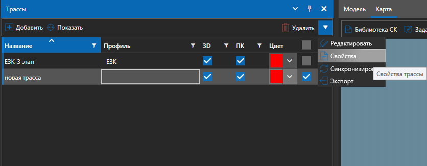 Для просмотра сведений о добавленных трассах необходимо открыть панель «Свойства».