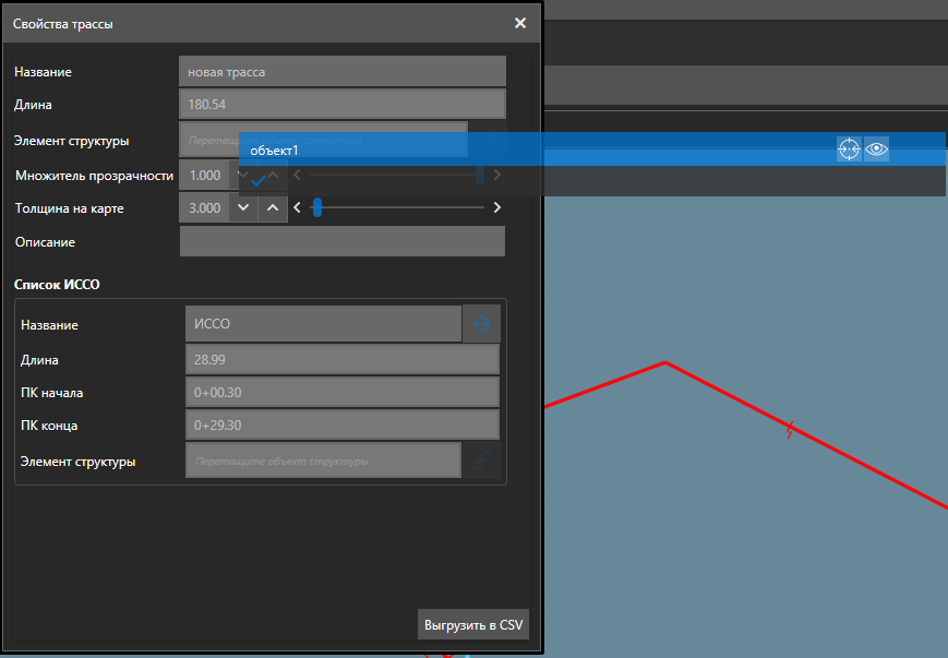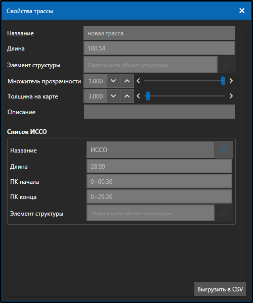 На панели «Свойства» отображается информация о трассе и добавленных ИССО.