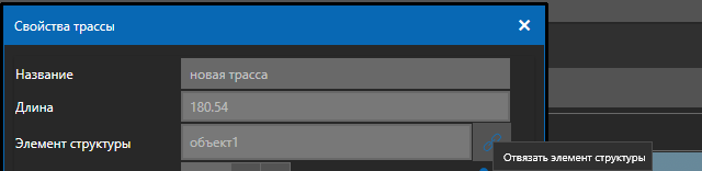 Чтобы отвязать элемент структуры, необходимо нажать правой кнопкой мыши на элемент структуры на панели «Свойства трассы и нажать на кнопку «Отвязать элемент структуры».