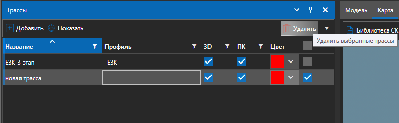 Трасса удалена из проекта. Таким же образом можно удалить сразу несколько трасс, отметив необходимые для удаления трассы и нажав кнопку «Удалить».