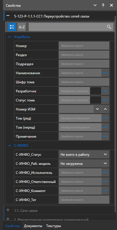 Для основной работы со свойствами объектов предназначена панель «Свойства» на вкладке «Просмотр». Панель содержит две области: «Свойства» и «Документы и фотографии».
