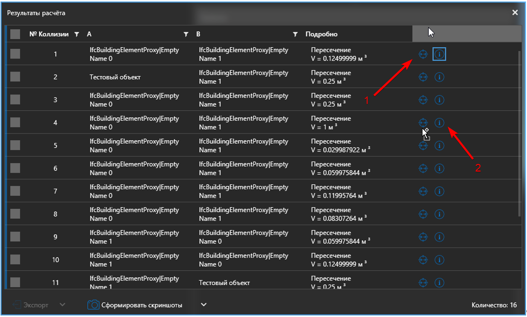 Для каждой коллизии предусмотрены кнопки фокусировки на коллизии (1) и кнопка просмотра детальной информации о коллизии (2).