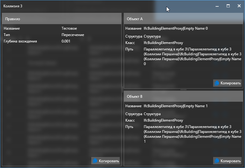 Детальная информация о коллизии выводится в виде всплывающего модально окна, в котором помимо уже указанной информации о коллизии так же указываются идентификаторы объектов структуры объектов наборов А и Б, классы объектов и их идентификаторы, параметры обнаруженной коллизии, например глубина вхождения. Эту информацию пользователь может скопировать в буфер обмена, либо создать отчет по выбранной коллизии.