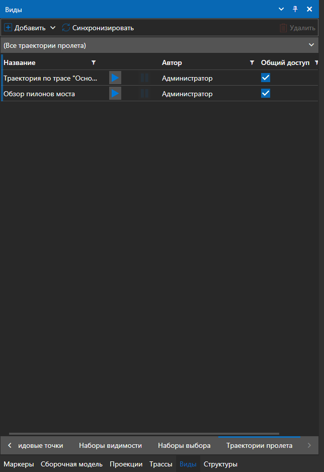 У каждой траектории есть кнопка запуска пролета просмотра по траектории и кнопка редактирования траектории.
