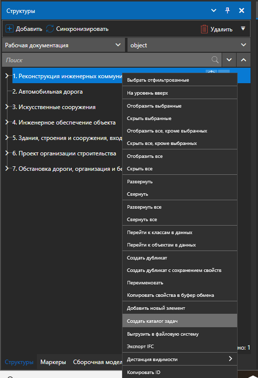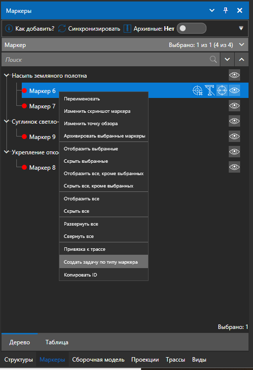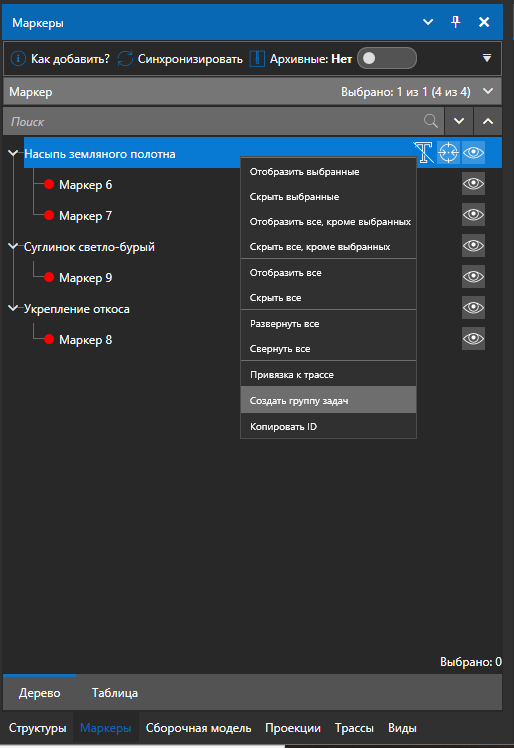 Пользователь может создать задачи из маркеров или групп маркеров. Задачи из маркеров создаются в активном каталоге задач. Если группа задач не выбрана, то группа задач создается в корне каталога задач, если выбрана группа задач, то в выбранной группе. Выбрав тип маркера или объект привязки маркера можно создать группу задач.