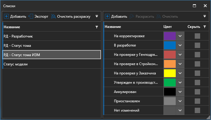 Для того, чтобы открыть окно управления «Списками» проекта, нажмите кнопку -