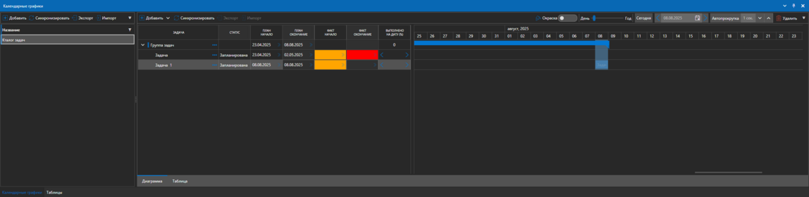 Для создания и управления задачами используется панель «Календарные графики». В данном окне можно создавать новые задачи, просматривать текущие задачи, осуществлять фильтрацию и сортировку задач по выбранным признакам и критериям.
