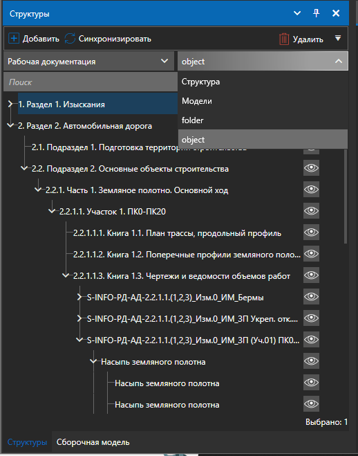 Каждой структуре соответствует свой список уровней детализации. В списке отображаются уровни, доступные для данного пользователя проекта. Каждому уровню детализации советует своя детализация отображения дерева структуры. Для смены соответствующей логической детализации дерева структуры выберете в списке необходимый уровень детализации.