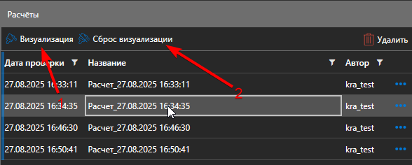 Настройка визуализации осуществляется для расчёта проверки (1). Визуализируются объекты и коллизии выбранного пользователем расчета. Визуализация расчета производится после выбора пользователем настроек визуализации.