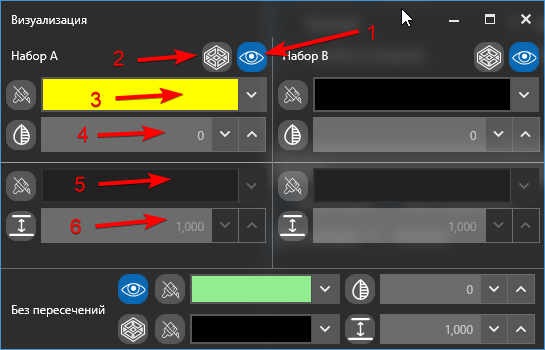 В верхней части интерфейса настройки визуализации для наборов объектов сравнения, в нижней части находится блок настроек визуализации для остальных объектов модели, которые не имеют пересечений.